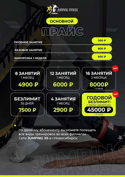 JUMPING XS — гуру в мире джампинга и первооткрыватели джампинг-фитнеса в Новосибирске со своей авторской, мощной методикой ведения тренировок, благодаря которой, наши клиенты получают отличные результаты за короткий промежуток времени.